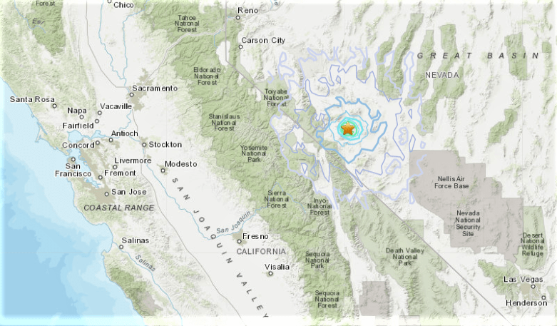 O epicentro foi na cidade fantasma de Candelaria, Nevada – 15 milhas ao sul de Mina e cerca de 50 milhas a leste do Lago Mono na Califórnia. Estava a 15 milhas dos epicentros de um terremoto de 5,3 em 13 de novembro e um terremoto de 6,5 em 15 de maio (indicado por pontos laranja no mapa acima).