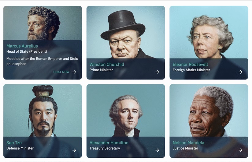 A Ilha Sensay, como foi batizada, tem como presidente o imperador romano Marco Aurélio. Entre os outros líderes digitais estão o primeiro-ministro Winston Churchill, Nelson Mandela no Ministério da Justiça e Sun Tzu no Ministério da Defesa. Os criadores afirmam que cada réplica de IA foi programada para “incorporar o conhecimento, os valores e a ética de tomada de decisão” de seus equivalentes históricos.