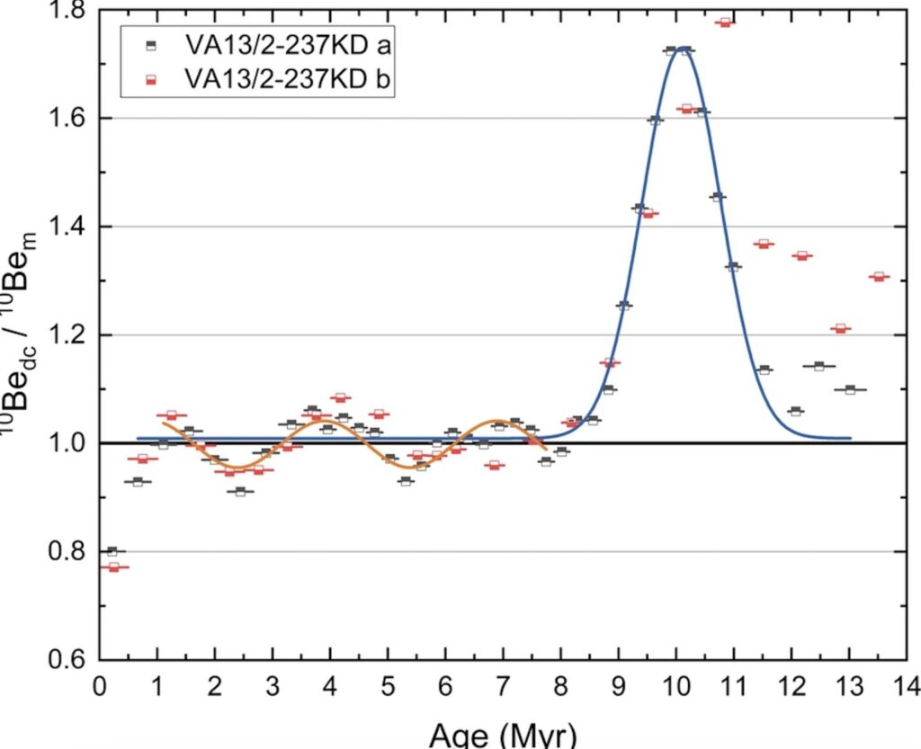 Cientistas na Alemanha descobriram um pico surpreendente de berílio-10 em sedimentos no fundo do Oceano Pacífico. Este isótopo radioativo é tipicamente formado de maneira constante quando raios cósmicos atingem a atmosfera da Terra, e depois se deposita uniformemente no fundo do mar.