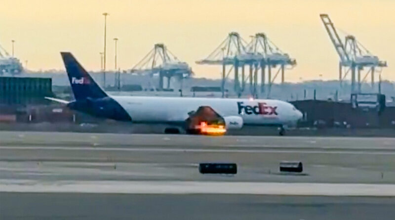 Um avião de carga da FedEx pegou fogo logo após decolar do Aeroporto de Newark, em Nova Jersey, na manhã de sábado, após colidir com pássaros.