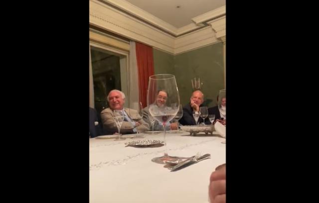 Os presentes no encontro riem e aplaudem a imitação de André Marinho. Segundo informações do portal Poder360, estavam no encontro, além de Temer e André Marinho: