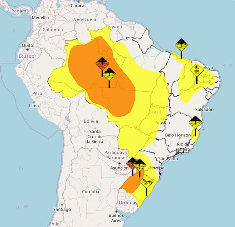 - Sul (Rio Grande do Sul em alerta): O estado gaúcho deve enfrentar chuvas em todas as regiões, com maior volume e risco de temporais, trovoadas e granizo na metade Norte. A Climatempo e o INMET emitiram alertas de perigo potencial e perigo para tempestades.