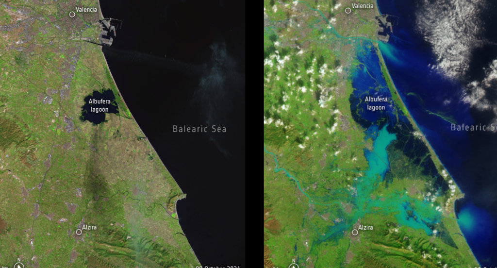 Imagens captadas pelo satélite da ESA mostram antes e depois da passagem da DANA pela Comunidade Valenciana.