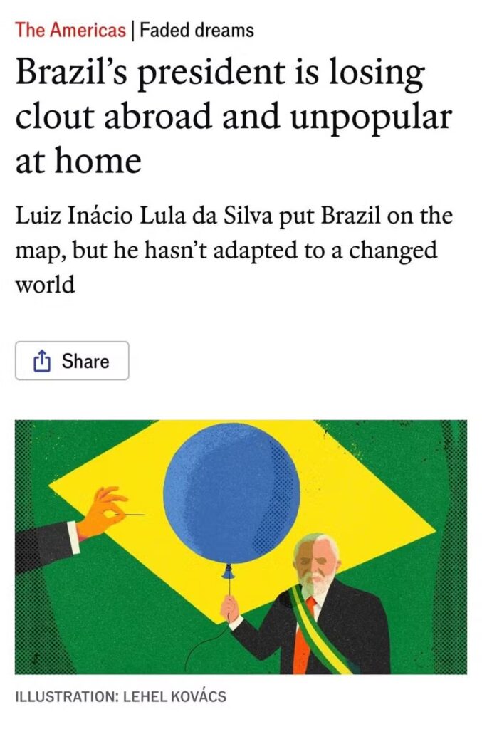Além da distância dos EUA, o texto critica a preferência de Lula por se aproximar de líderes como Xi Jinping (China) e Vladimir Putin (Rússia), apesar de reconhecer uma aproximação com a Europa. A revista ainda aponta a relutância de Lula em dialogar com o presidente argentino, Javier Milei, por “diferenças ideológicas”.