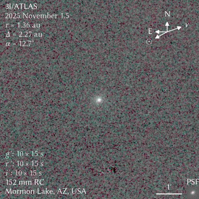 O cometa interestelar 3I/ATLAS, o terceiro objeto desse tipo já registrado, reapareceu no céu da Terra após concluir sua passagem por trás do Sol (periélio), atingido em 29 de outubro. A primeira imagem óptica pós-periélio foi capturada em 31 de outubro pelo pós-doutorando Qicheng Zhang, do Observatório Lowell, no Arizona, usando o poderoso Telescópio Discovery.
